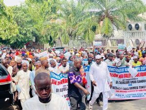 Thousands of All Progressives Congress (APC) members gathered today in Abuja for a mass rally in solidarity with the party’s National Chairman, Dr. Abdullahi Umar Ganduje, amidst recent controversies surrounding his position.