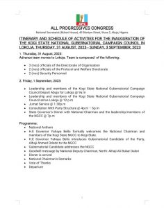 The APC National Chairman, Dr. Abdullahi Ganduje, accompanied by the National Working Committee, Governor of Kogi State, Yahaya Bello & Party leaders, stormed the State capital, Lokoja, ahead of today’s